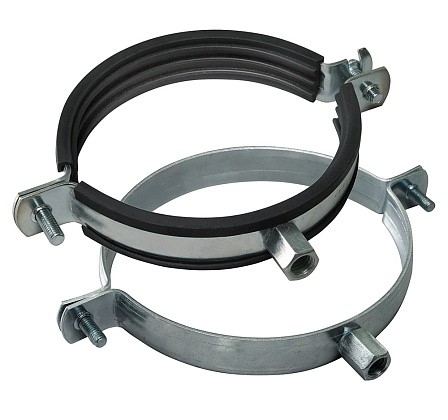 Хомуты используются при монтаже систем вентиляции и кондиционирования для крепления различных элементов системы к стенам и потолку при помощи резьбовой шпильки и забивного анкера.